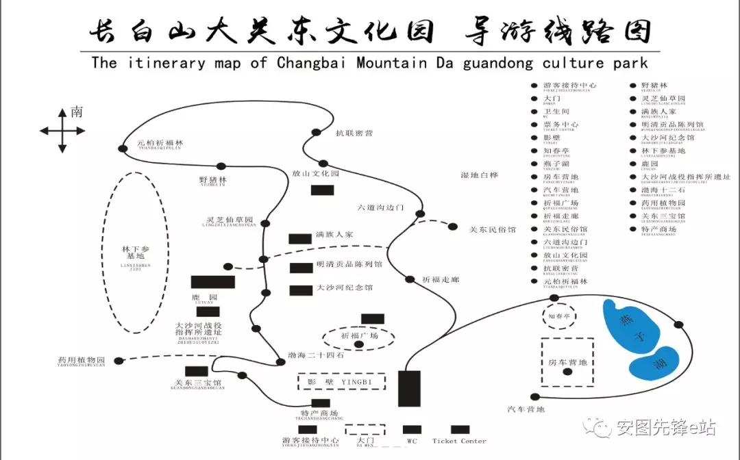 长白山大关东文化园长白山大关东文化园是国家AAAA级景区。园区位于长白山第一县安图永庆乡东清村,距离长白山85公里,园区所在的东清村曾是渤海国州府所在地。有着一千两百多年的历史。景区占地面积72公顷,其中原始森林58公顷,集大量的长白山动植物资源,有自然条件下生长的东北“三宝”:人参、梅花鹿、乌拉草(紫貂)。还有被誉为东北第四宝的雪蛤;景区还是安图县爱国主义教育基地之一,东北抗联著名战役“大沙河阻击战”就发生在这里;景区内留有长白山不同时期的众多历史文化遗迹;这里还拥有长白山旅游沿线服务设施和功能完善的汽车服务区。截止2017年8月末,景区共接待游客36.5万人,收入1700万。